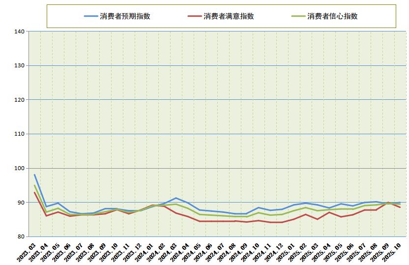 全国消费者信心调查显示,2025年10月,中国消费者信心指数为89.4,比上月低0.2点;其中,消费者满意指数为88.5,比上月低1.4点;消费者预期指数为89.9,比上月高0.4点。